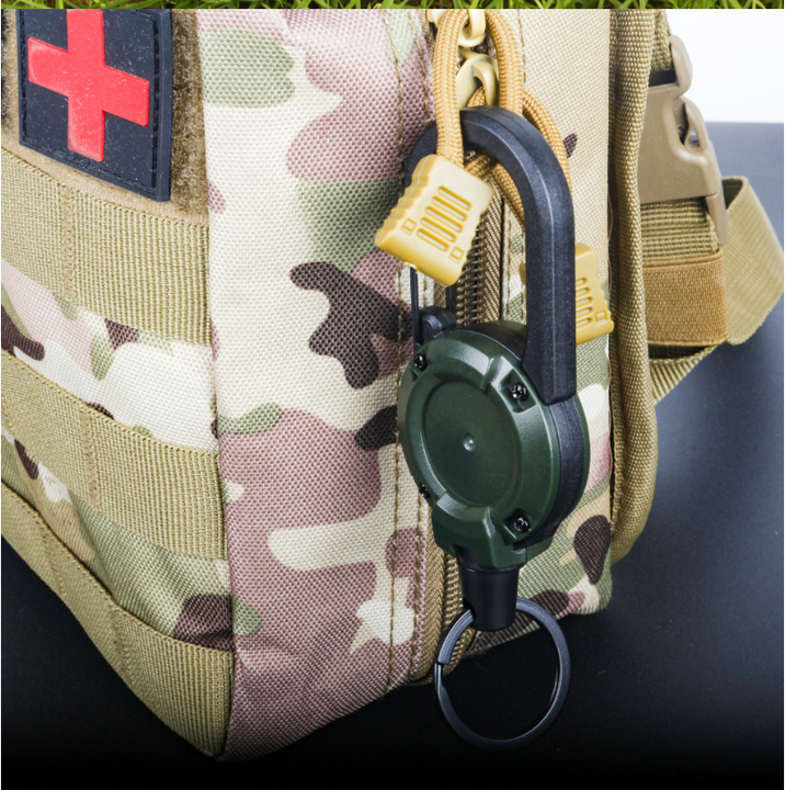 OUTLANDRA Olive EDC Retractor to niezawodny zwijany brelok z karabińczykiem, który doskonale sprawdzi się zarówno w terenie, jak i na co dzień. Dzięki solidnemu mechanizmowi retraktora oraz wytrzymałemu karabińczykowi, zyskujesz szybki dostęp do kluczy, identyfikatora, scyzoryka czy małego narzędzia EDC – bez ryzyka zgubienia i bez konieczności odpinania ich od plecaka lub paska.