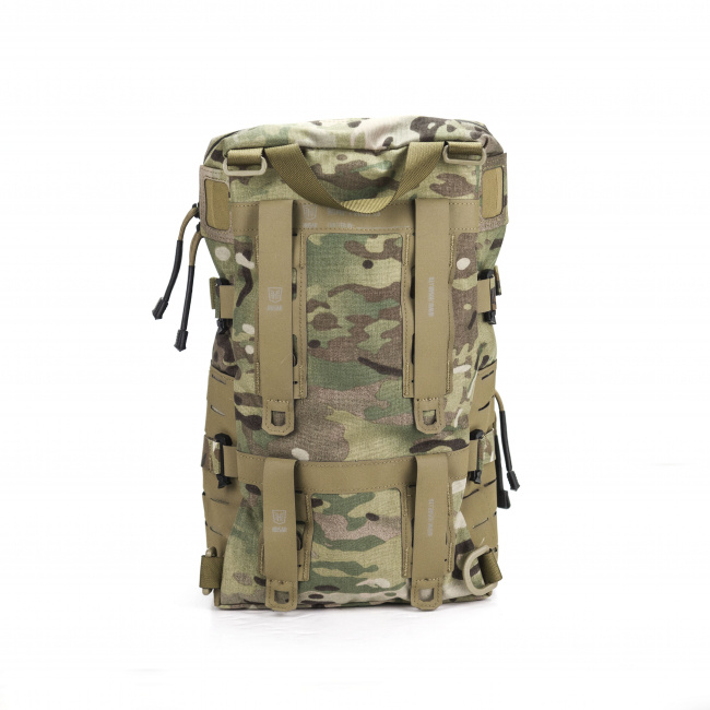 Boki plecaka są następnie ulepszane do laserowo wycinanego systemu MOLLE panele do mocowania dodatkowego wyposażenia.