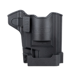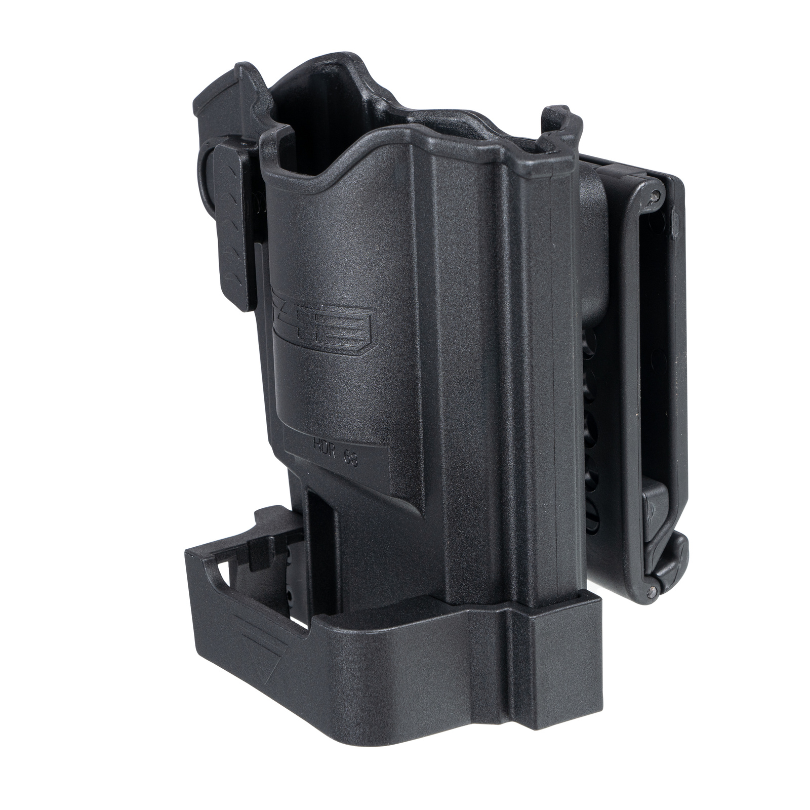W kaburze zastosowano automatyczną blokadę, która zapobiega wypadnięciu markera podczas przenoszenia oraz chroni przed nieautoryzowanym dostępem. Dobycie rewolweru wymaga odpowiedniego chwytu oraz wciśnięcia palcem wskazującym przycisku blokady, umieszczonej na zewnętrznej ściance kabury. To skuteczne i proste w obsłudze zabezpieczenie utrudnia dostęp osobom niepowołanym i zapewnia bezpieczeństwo podczas noszenia oraz wyjmowania rewolweru.