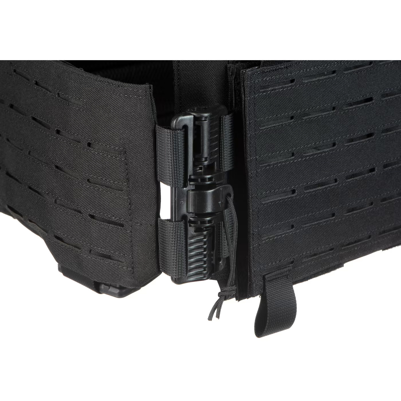 Z tyłu umieszczono elastyczny cummerbund, który pozwala na regulację szerokości i dopasowanie kamizelki do budowy ciała. Dodatkowe kieszenie boczne wewnątrz pasa umożliwiają przenoszenie sprzętu, takiego jak magazynki, radio czy drobne akcesoria, bez zajmowania przestrzeni na zewnątrz.