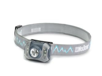 Lampa czołowa o dalekim zasięgu (20m) i bardzo mocnym świetle 3 diod 0,2W. Posiada również światło 4 białych diod, przydatne do czytania.