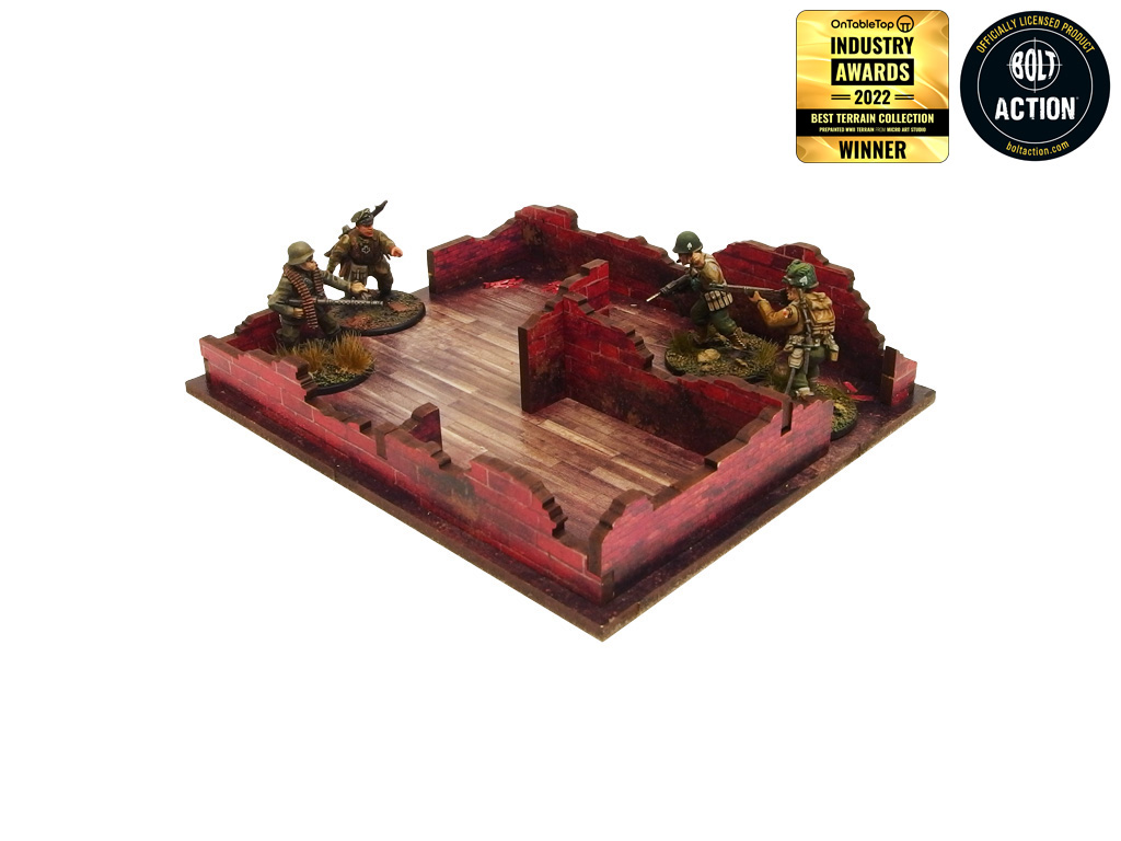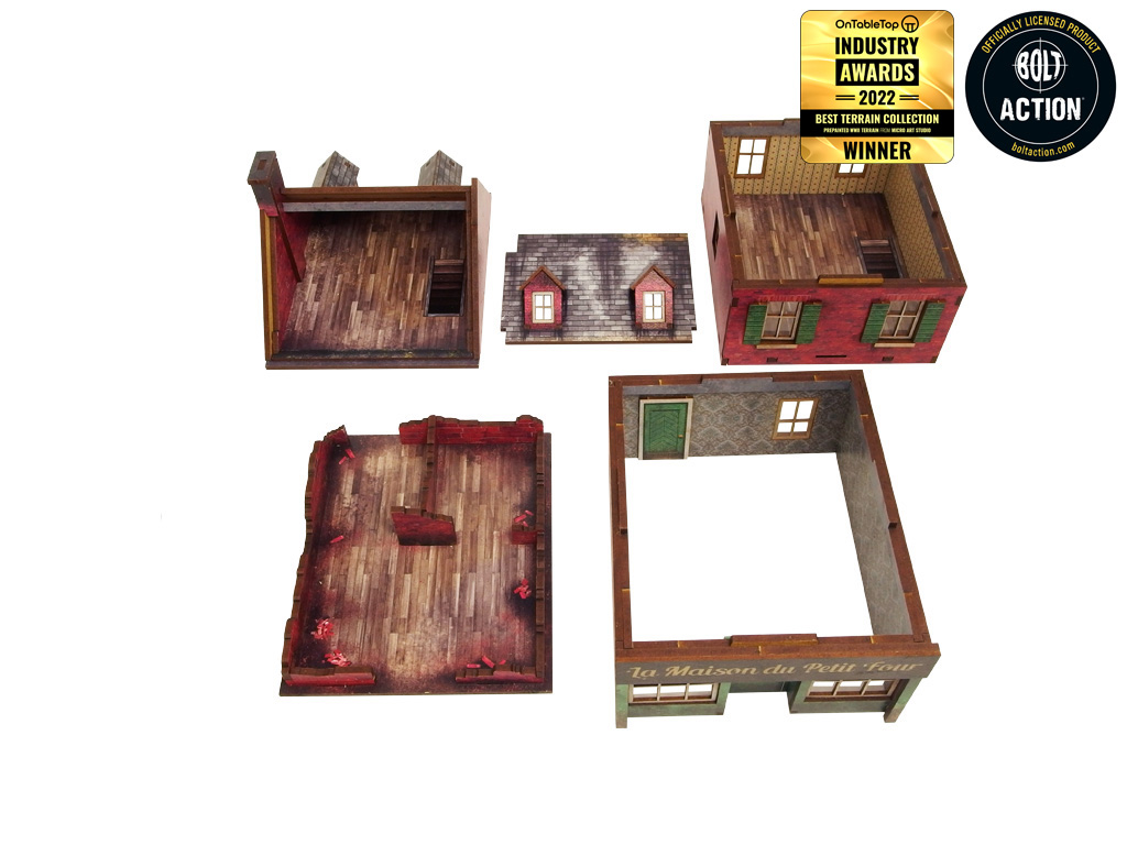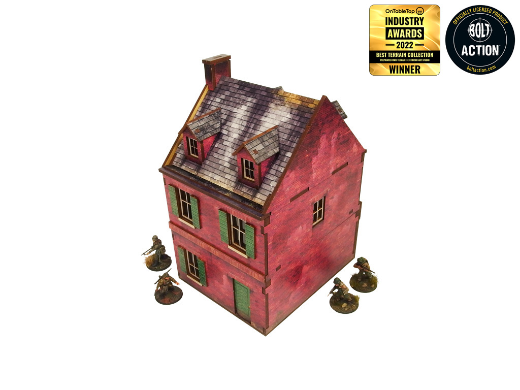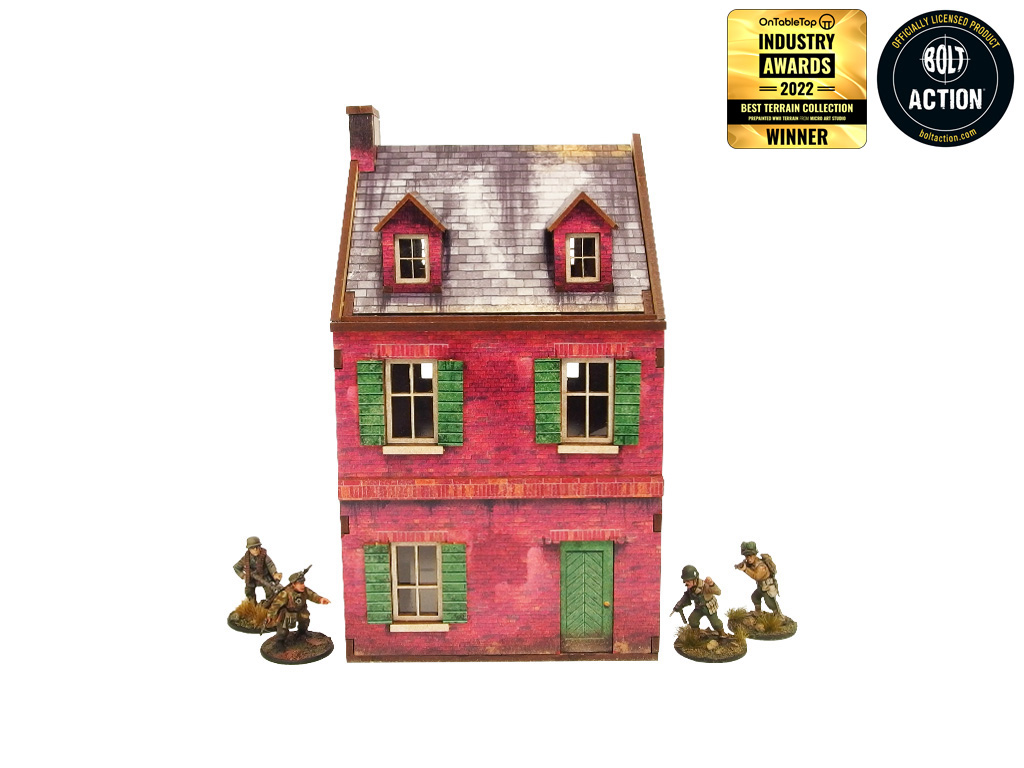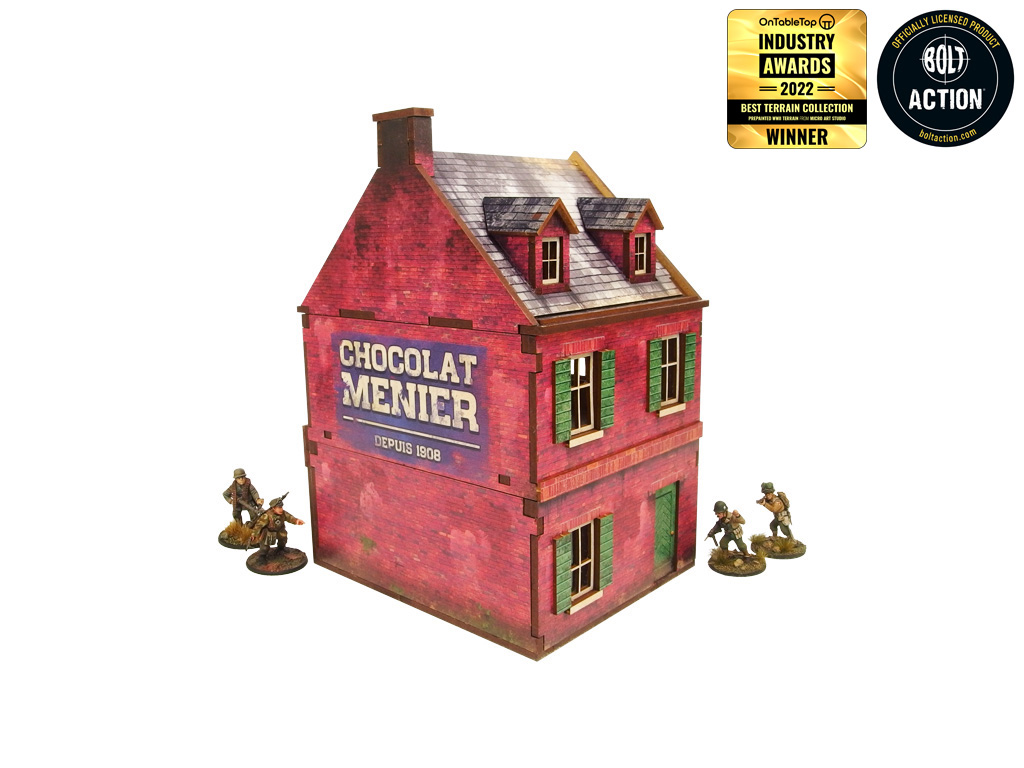 Opis produktu: Multikolorowy, malowany (UV) budynek kawiarni z Normandii z okresu II wojny światowej to doskonała dekoracja do gier planszowych lub wargamingowych. Z trzema poziomami i kolorowymi wnętrzami, umożliwiający dostęp do wnętrza, z możliwością demontażu poziomów i usunięcia zniszczonego parteru. Zapewnia wystarczającą przestrzeń na cały oddział piechoty. W zestawie są wycięte akrylowe przezroczyste szyby okienne. Istnieje możliwość montażu z otwartymi lub zamkniętymi okiennicami i drzwiami. Opcjonalna tablica reklamowa w zestawie.