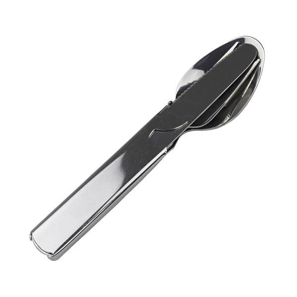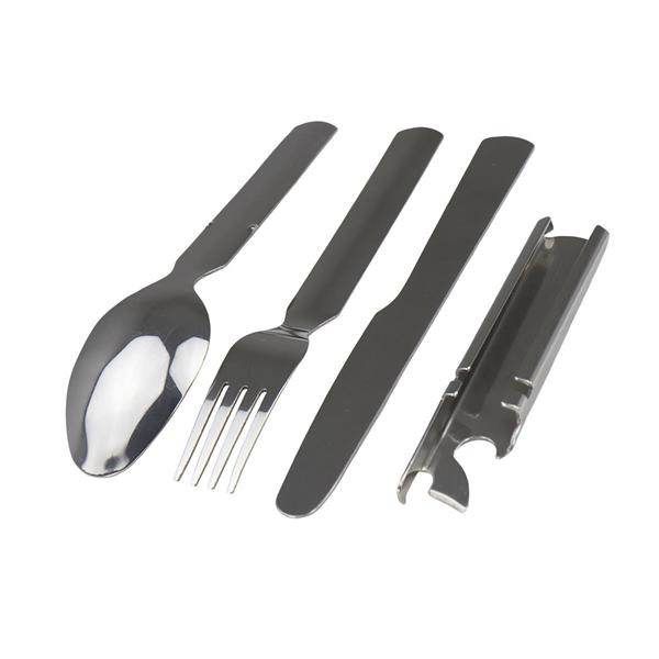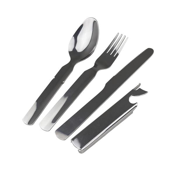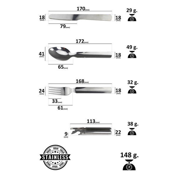 Zawartość zestawu: nóż, widelec, łyżka, otwieracz do puszek, otwieracz do butelek, etui