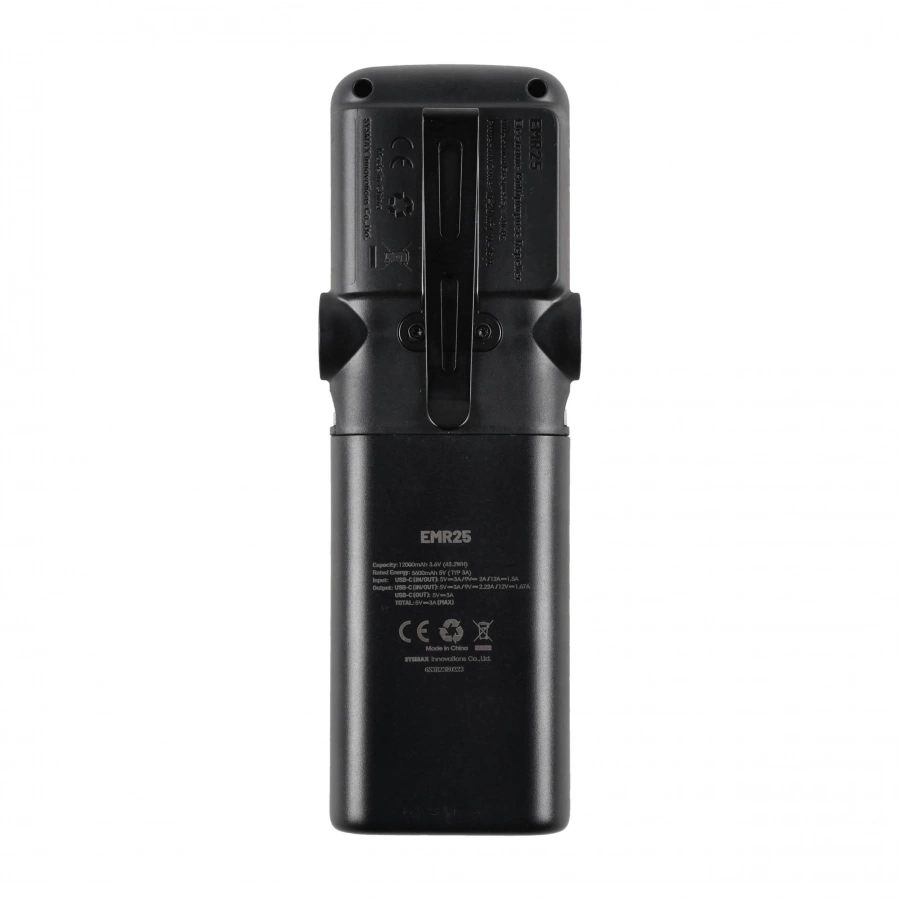 EMR25 ma większy akumulator (12000 mAh vs 8000 mAh), dłuższy czas działania (12 h vs 8 h) i dodatkową funkcję ultradźwięków. EMR23 to lżejszy i bardziej kompaktowy odpowiednik z podstawową ochroną i funkcją powerbanku.