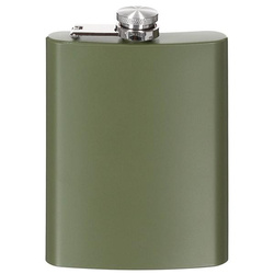 Piersiówka o klasyczny, zakrzywiony kształcie wykonana ze stali nierdzewnej pokrytej farba w kolorze olive drab.