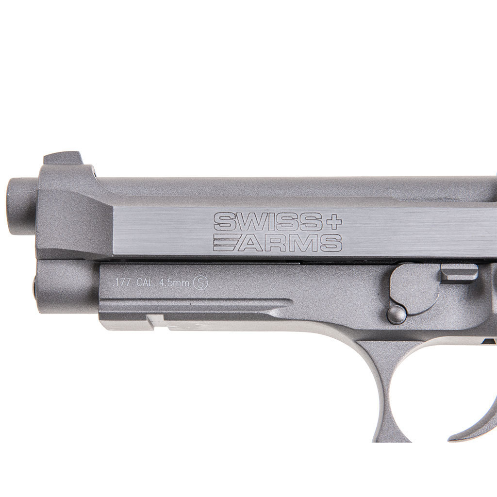 Wykonana w całości z metalu, ciężka replika Beretty 92. Pistolet strzela śrutem kulistym typu BB (4,5 mm). Napęd stanowi 12-gramowy nabój CO2 umieszczany w magazynku mieszczącym 21 śrucin. Pistolet działa - podobnie jak w modelu na ostrą amunicję - zarówno w systemie SA (Single Action) jak i DA (Double Action). Pistolet na korpusie posiada oryginalne oznaczenia Swiss Arms, szwajcarskiej firmy zajmującej się produkcją broni strzeleckiej.