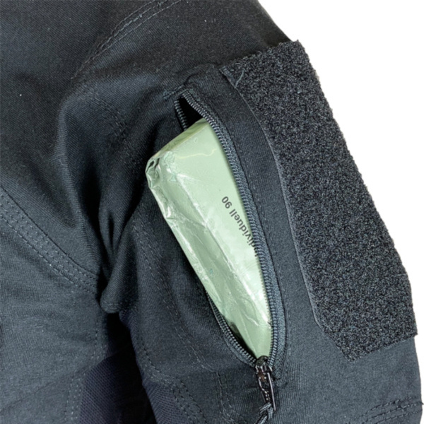 Po bokach i pod ramionami ma lekką, miękką i oddychającą siateczkę, która zapewnia niezbędne chłodzenie w gorących sytuacjach. Również na bokach znajdują się torebki na smartfona lub inne płaskie przedmioty. Tuleje kablowe umożliwiają ukryte prowadzenie słuchawek lub innych kabli. Zintegrowane kieszenie na górnych ramionach z zamkami YKK mają również wejścia kablowe po obu stronach. Rzep na ramiona i na klatce piersiowej pozwala na nakładanie naszywek z nazwiskami, insygnia rangi i innych.