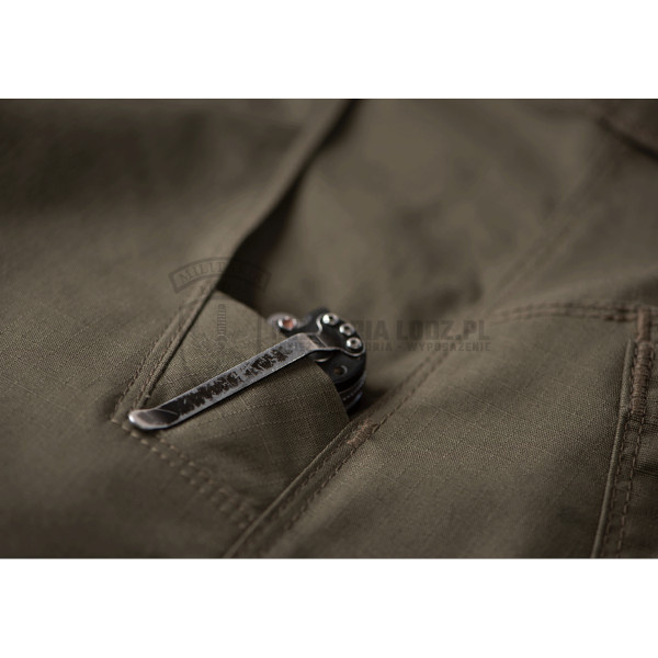 • Elastyczny materiał – Wykonane z mieszanki Policotton RipStop, zapewniającej wytrzymałość oraz swobodę ruchów dzięki dopasowanemu krojowi.