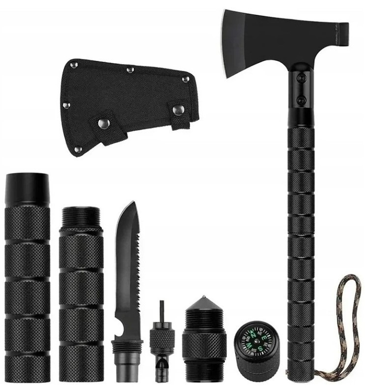 Wielofunkcyjny nóż: Zestaw zawiera wielofunkcyjny nożyk, który oprócz ostrza posiada piłę i otwieracz do butelek. Dzięki gwintom można go przymocować do elementów rękojeści i używać jako włóczni.